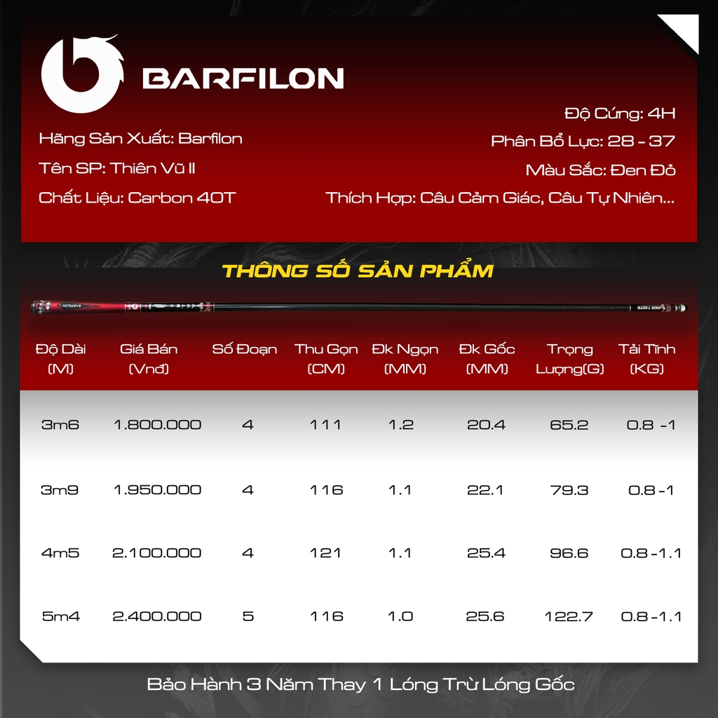 Vẫn được biết đến là dòng cần câu cá cao cấp, nay chúng tôi là đơn vị duy nhất thực hiện chế độ BẢO HÀNH 3 NĂM THAY 1 LÓNG TRỪ GỐC cho các dòng cần tay BARFILON.